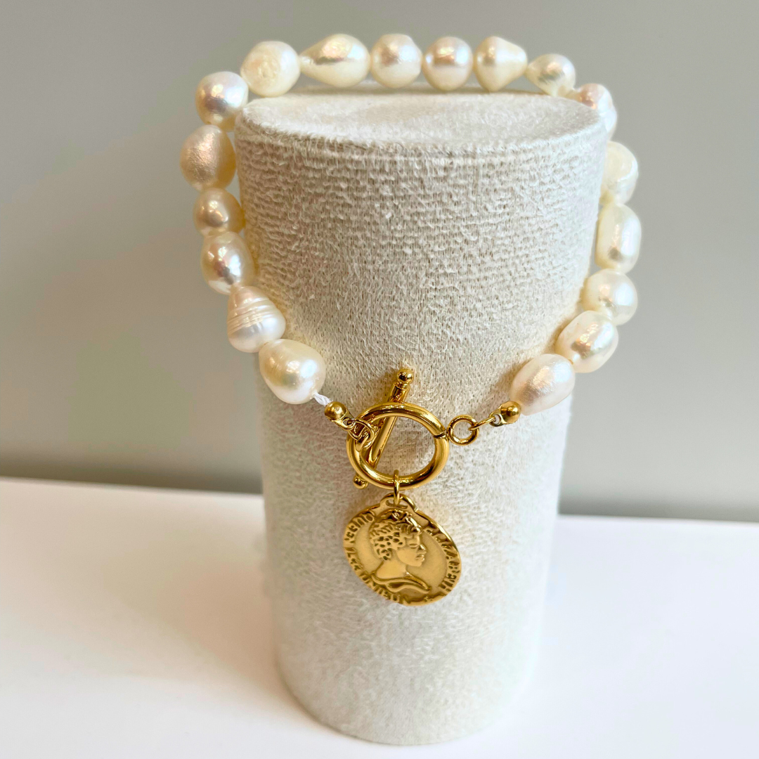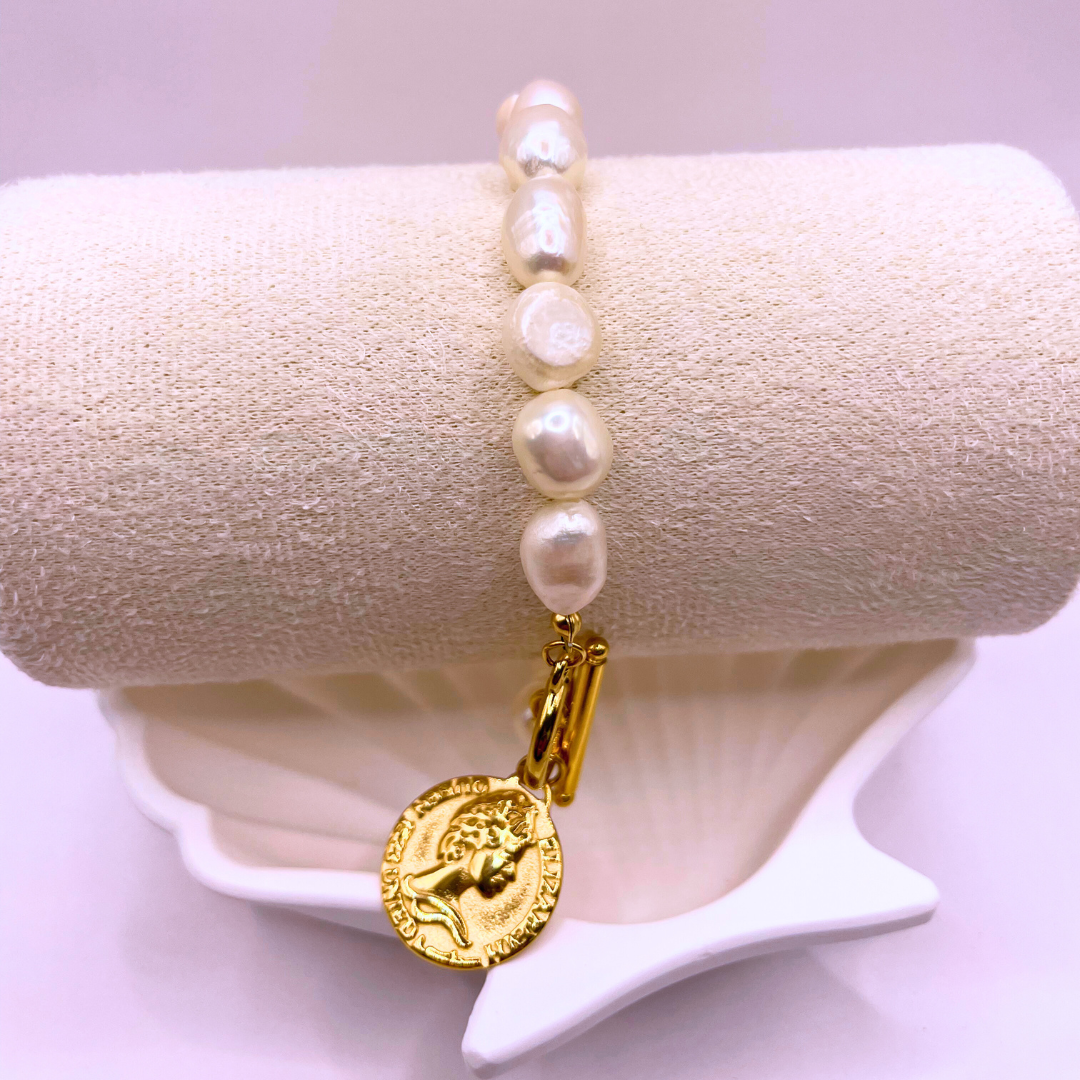 Jemný náramek tvořený šňůrkou s navlečenými pravými říčními perlami, které vynikají svou přirozenou krásou a jedinečným leskem. Zapínání je vyrobeno z kvalitní nerezové oceli, pozlacené 18k zlatem, což zajišťuje odolnost a dlouhou životnost. Tento elegantní doplněk podtrhne ženskost a stane se vaším oblíbeným šperkem pro každodenní nošení i slavnostní chvíle.