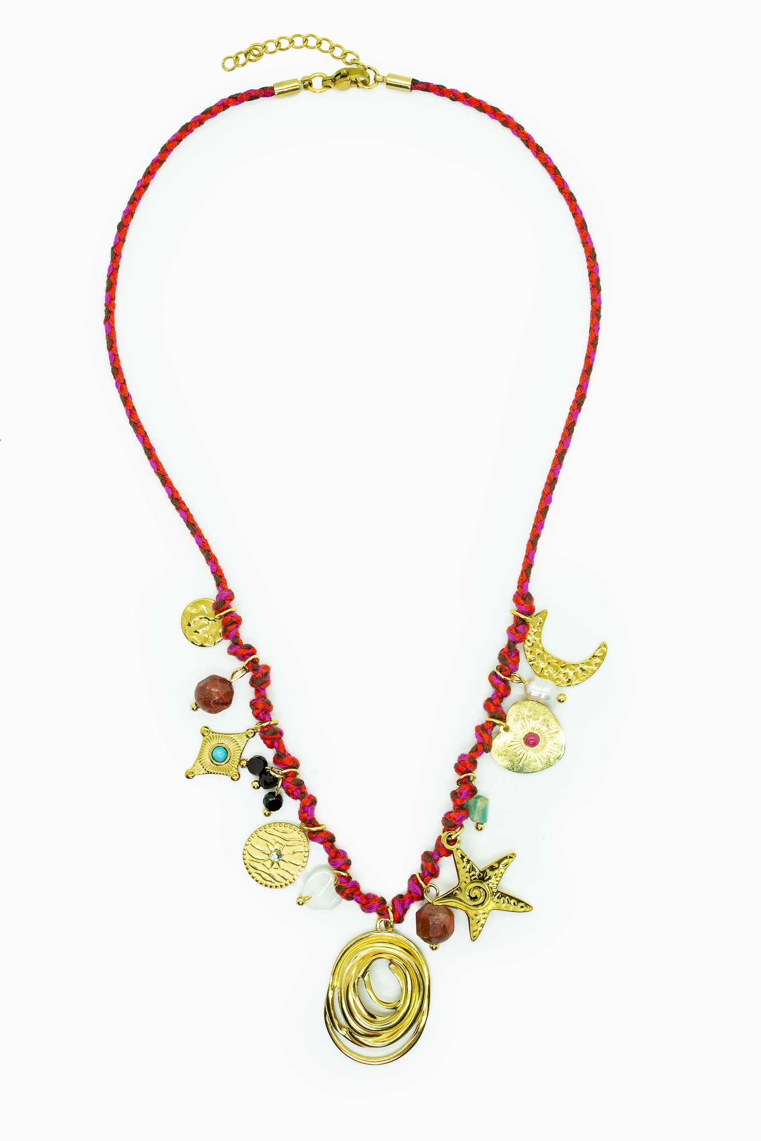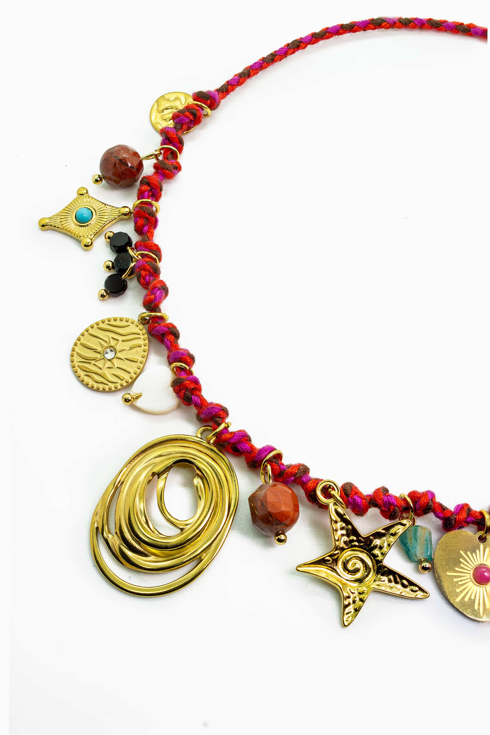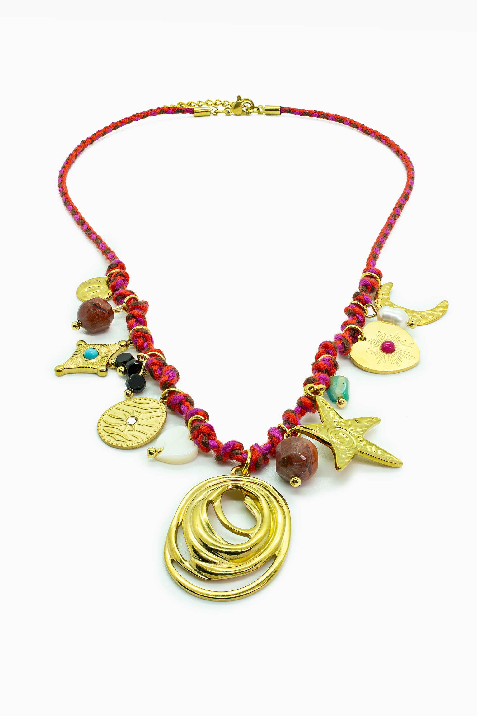 Tento náhrdelník umisťuje vrstvené zlaté kroužky do středu a doplňuje je strukturovanými mincovými přívěsky, přívěskem hvězdice, půlměsícem, skleněnými korálky a drobnými barevnými akcenty, které vytvářejí strukturovaný a detailní vzhled.