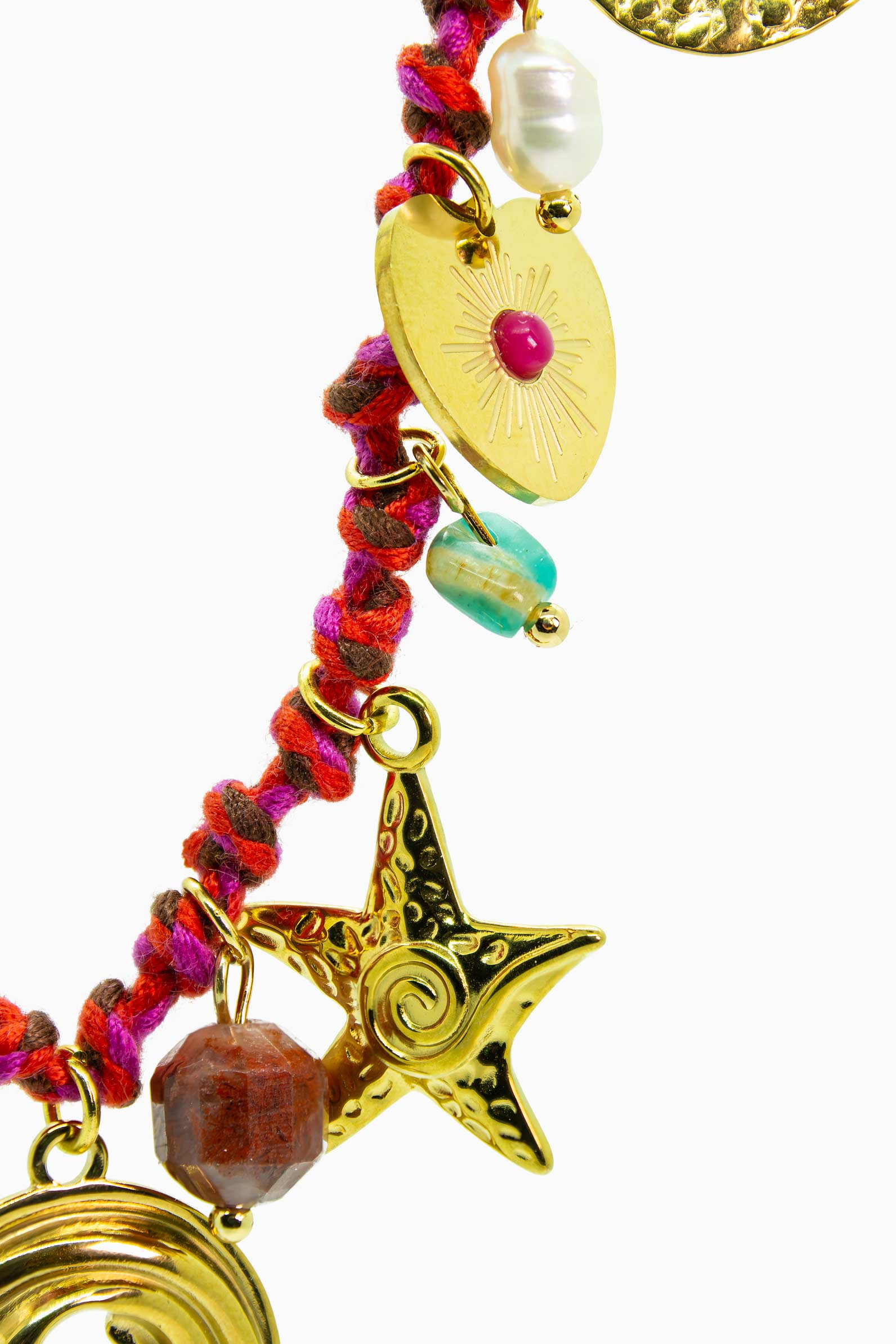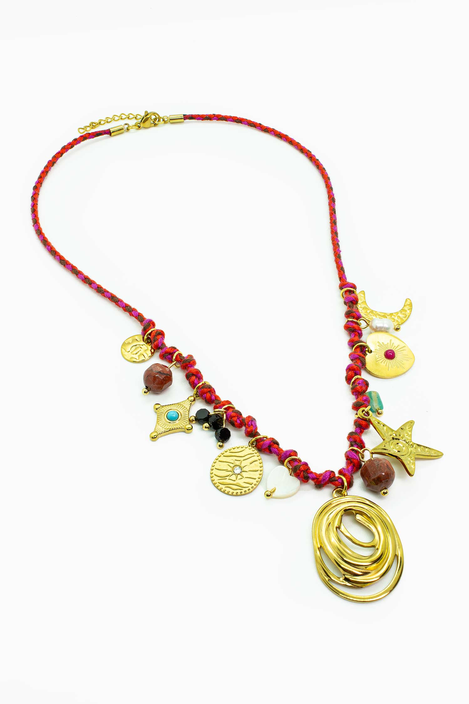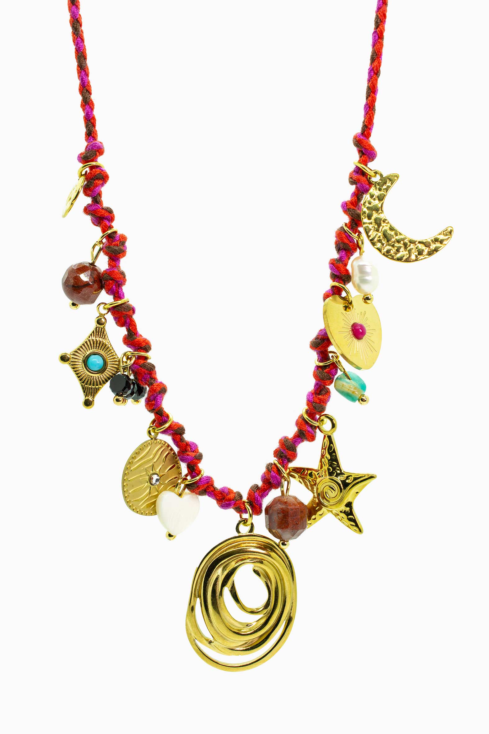 Tento náhrdelník umisťuje vrstvené zlaté kroužky do středu a doplňuje je strukturovanými mincovými přívěsky, přívěskem hvězdice, půlměsícem, skleněnými korálky a drobnými barevnými akcenty, které vytvářejí strukturovaný a detailní vzhled.
